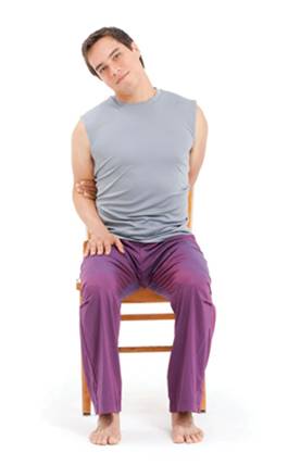 From seated mountain pose, reach your arms behind you and clasp your elbows with your opposite hands. Then release your right hand and place it on your right thigh, with your left hand holding your right arm just above the inside of the elbow. Inhale as you lengthen the crown of your head toward the sky; then exhale and release your right ear down toward your right shoulder, trying not to lift the shoulder toward the ear. Drop your left shoulder down and breathe into the left side of your neck. Stay here for several breaths, then exhale and gently rotate your head so that your nose moves toward your right shoulder. Inhale and rotate your head the other way so that your nose moves toward the sky.