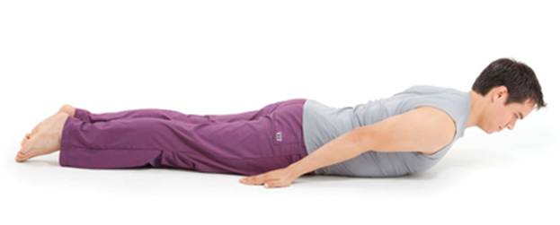 Unlike other variations of bhujangasana, in which the arms can help raise the back, this version requires the back muscles to do all the work. As a result, this pose helps strengthen many of the muscles that tend to be weakened and stretched by forward head position, including the middle and lower trapezius, latissimus dorsi, rhomboids, and serratus posterior. Lying on your belly, bring your arms down by your sides, palms facing down, and your chin or your forehead to the floor (you can place a small folded towel under your forehead if you like). Root down through your pubic bone, and press your legs and the tops of your feet down into the earth, lengthening back through your feet. Find your breath. On an inhalation, lift your head, neck, shoulders, and upper back as high as you comfortably can, keeping the hands on the floor. The goal is to create a slight backbend in the upper spine without stressing the low back. On an exhalation, relax everything back down. Continue with this practice, inhaling up and exhaling down for 3 to 6 breaths. For an extra challenge, stay in the lifted pose for several slow, deep breath cycles. Be sure to keep your neck long so that you’re not just cranking your neck up and down but using your back muscles to lift the back and shoulders; imagine that you have an eye in the back of your neck, and try to keep that imaginary eye wide open. Arm Variation: Clasp your hands behind your back, keeping the elbows soft. On an inhalation—as you lift your back, shoulders, and head—also lift your clasped hands up away from the tailbone and extend your arms back. Allow this action to help draw the shoulders back, and invite the arms to straighten without locking the elbows.